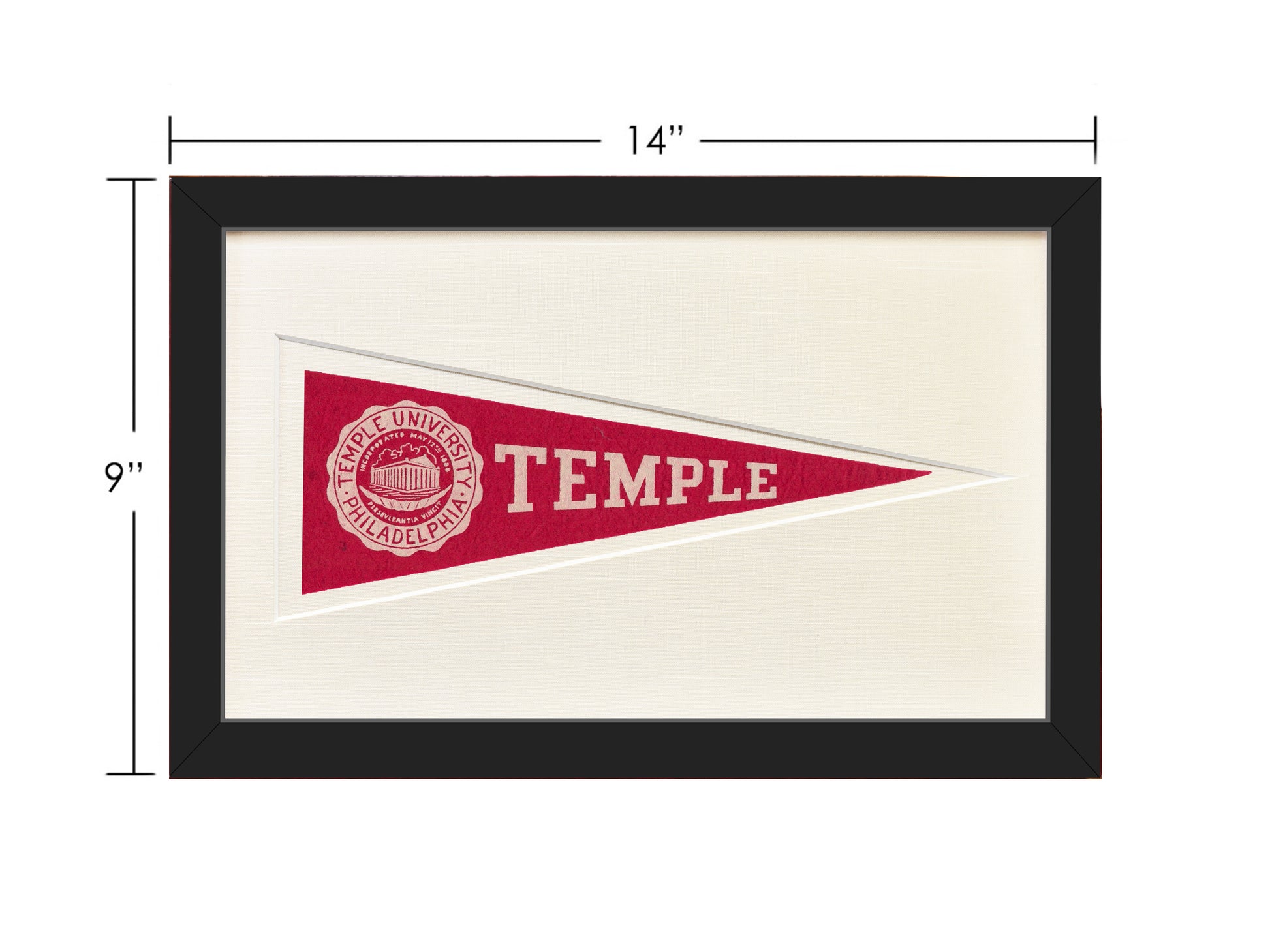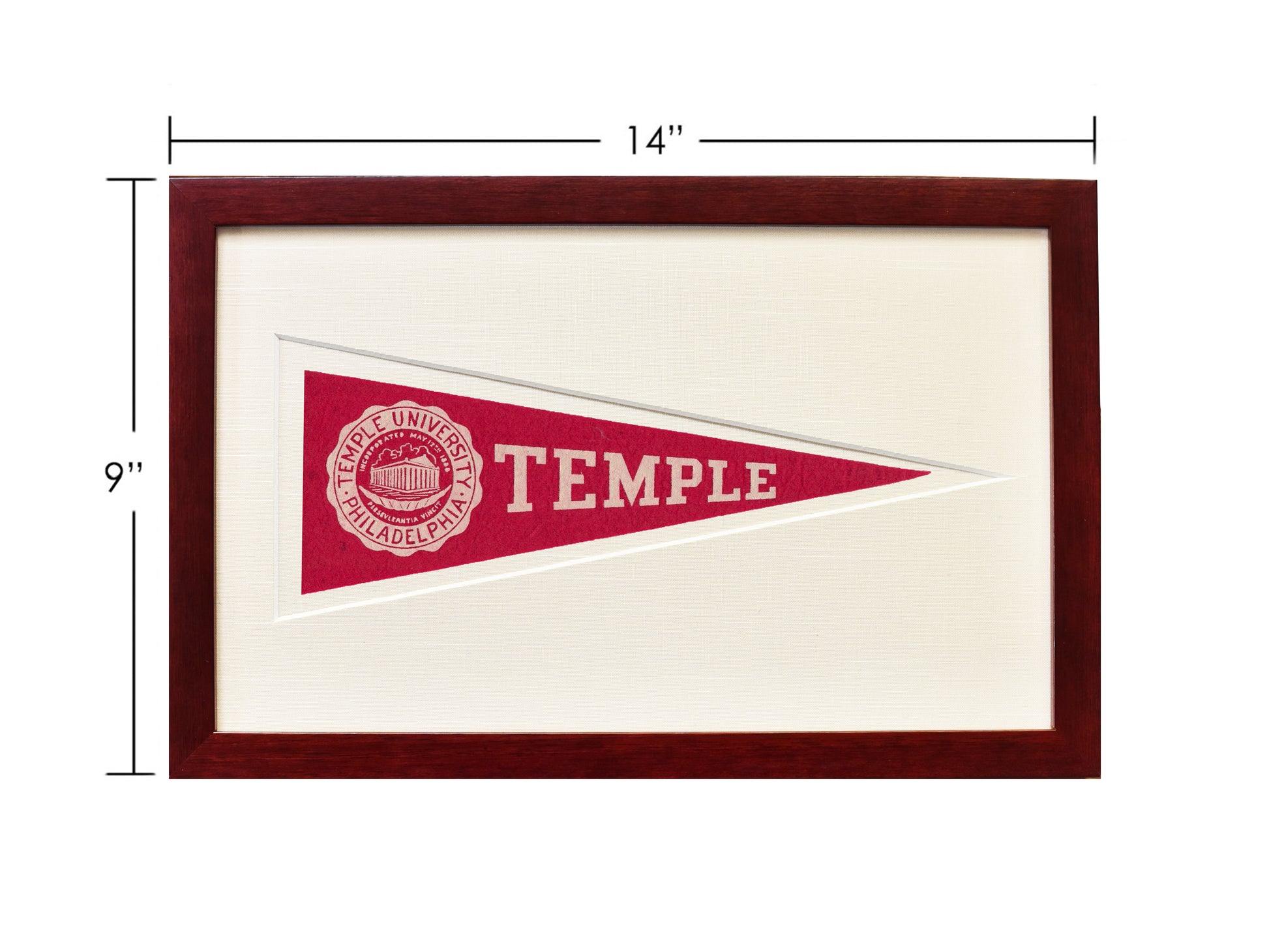 A rare piece of vintage Temple history from the 1950s available in your choice of a Black, Light Wood, or Mahogany frame. Framed in U/V glass and cut mat with the history of Hormel Pennants on the back.