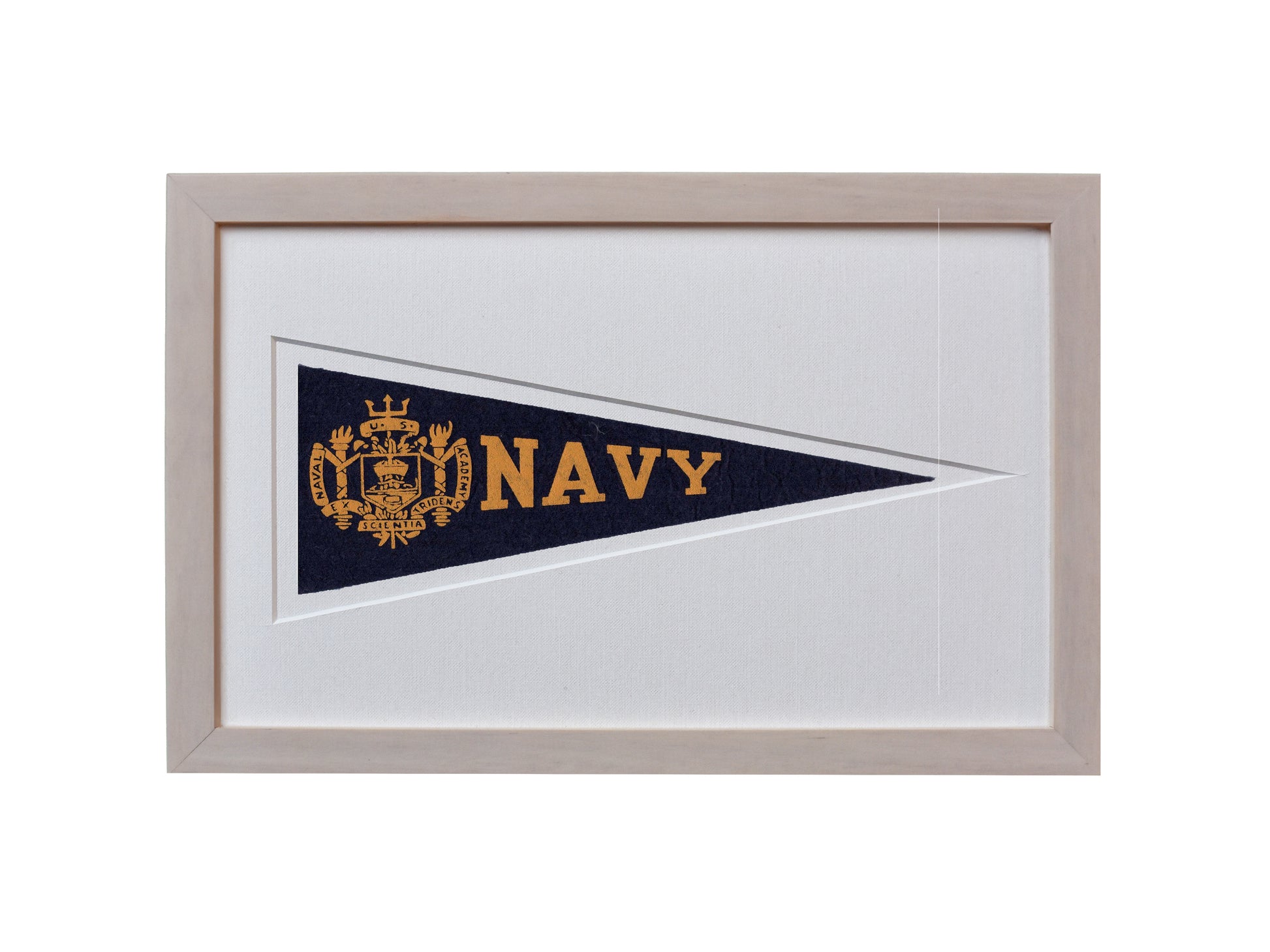 Ahoy Navy fans! A rare piece of vintage Navy history from the 1950s available in your choice of a Black, Light Wood, or Mahogany frame. Framed in U/V glass and cut mat with the history of Hormel Pennants on the back.