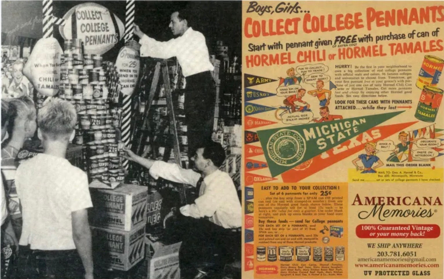 In the 1950s, collectibles were everywhere: baseball cards, comic books, stamps, and more. In 1953, the Hormel Company wanted to capitalize on this trend and attached over 5 million wool felt 4 x 9 inch pennants representing 95 different universities to their soup cans using rubber bands (seriously!).
